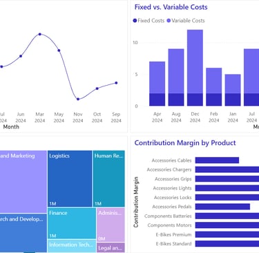 Analytical Capability: This view demonstrates cost accounting and operational intelligence. It digs into the "Cost of Goods Sold" to separate Fixed vs. Variable costs and tracks the "Cost per Unit" over time. This level of granularity is essential for manufacturing clients to identify supply chain inefficiencies, seasonal cost spikes, or production bottlenecks that are eroding margins.