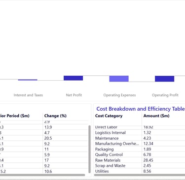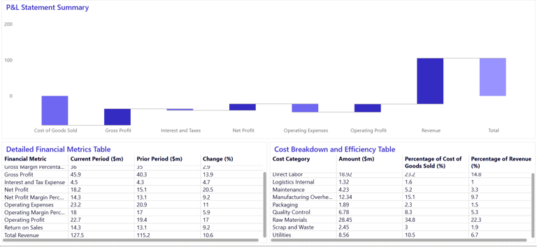 Analytical Capability: This dashboard focuses on financial transparency and variance explanation. Using a waterfall chart, it visualizes exactly how costs (COGS, Taxes, Operating Expenses) reduce topline revenue. The accompanying detailed tables offer a forensic view of line items (like Direct Labor, Raw Materials, and Depreciation), allowing finance teams to pinpoint exactly which expense lines are deviating from the budget or prior year.